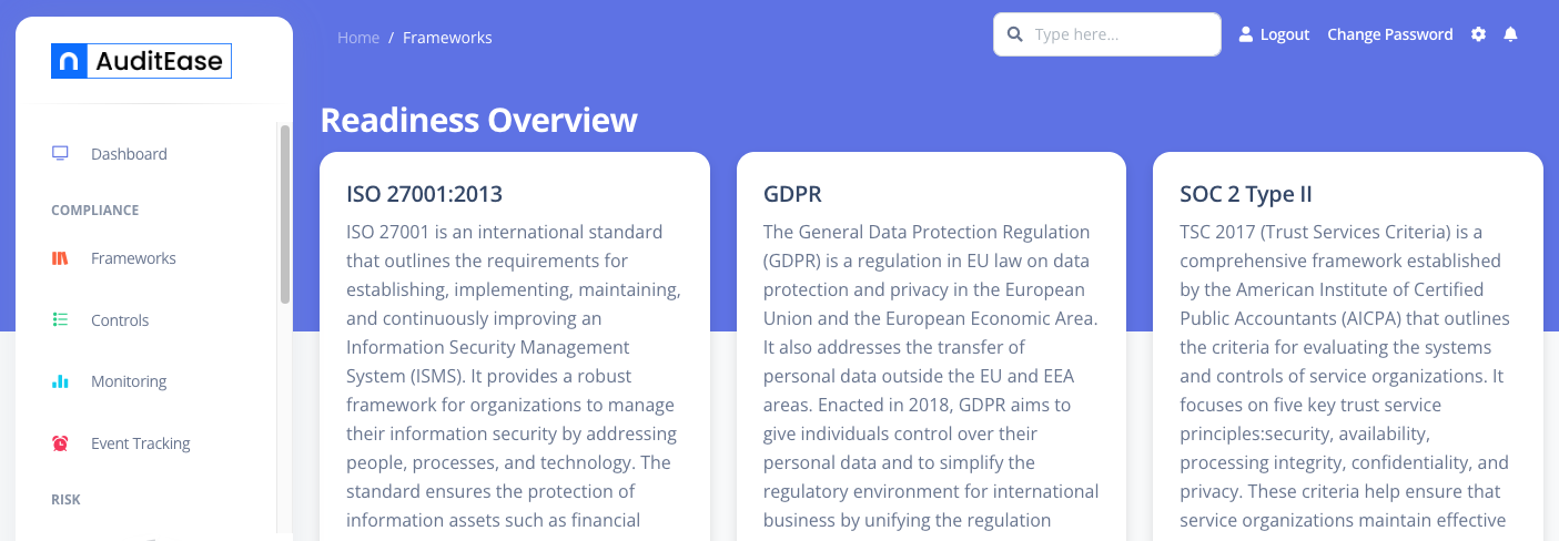 Overall, AuditEase is a valuable tool for organizations that need to maintain compliance with multiple standards and regulations. It simplifies the compliance management process, provides a range of tools and resources to help businesses develop their compliance policies and procedures, and ensures that organizations are able to meet their compliance obligations. With AuditEase, businesses can focus on their core operations, knowing that their compliance requirements are being effectively managed.